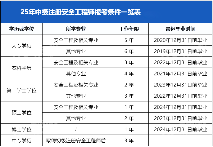 ③工作年限方面:工作年限计算的截止日期是2025年12月31日。从取得最高全日制学历的时间开始算起,非全日制学历的前后工作时间可累积计算。比如:毕业专业为安全工程及相关专业,2020年6月大专毕业出来工作(截止到25年12月31日已工作5年),这样也是符合报考条件的。