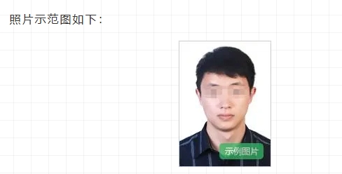 2.照片上传。考生须上传本人近6个月以内的免冠、正面、彩色、白底证件照,照片中显示考生头部和肩的上部,不允许戴帽子、头巾、发带、墨镜;照片格式及大小:JPG/JPEG格式,不大于200K。照片示范图如下: