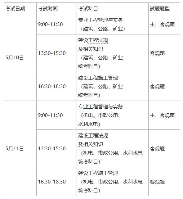 考试按《专业工程管理与实务》科目专业类别分2天2批次实施,具体考试时间、科目和题型见表格。