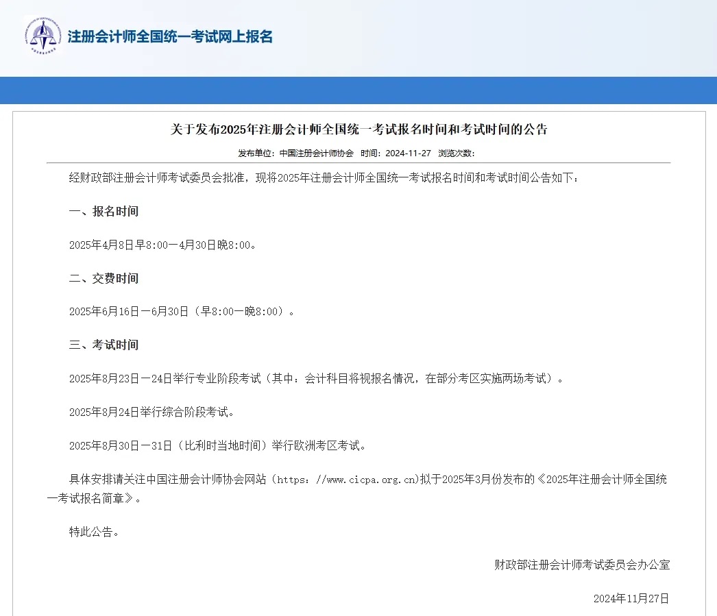 2025年CPA注册会计师考试时间确定 |